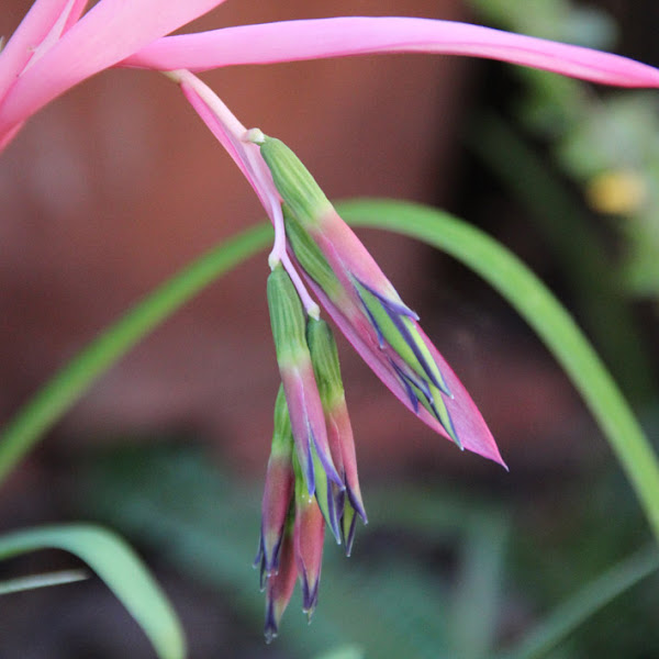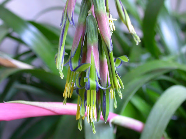 What kind of plant is queen's tears bromeliad? In spring the arching flower stalks carry pink bracts and pendant flowers that have chartreuse green petals edged with royal blue. The queen's tears bromeliad produces large arching stems covered in big showy pink bracts the last bracts on the stems open to reveal hanging clusters of green flowers with delicately recurving petals edged in deep bluish purple, contrasting bright yellow stamens along with matching pink calyxes. The nearly tubular 2 feet tall rosettes hold foot long slender leaves that have small teeth along the margins. Ebay.com has been visited by 1m+ users in the past month